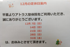 【臨時休業のお知らせ】 平素よりアトラス整体院をご利用いただきまして、ありがとうございます。 まことに勝手ではありますが、3月22日(月)はお休みとさせて頂きます。 ご迷惑をお掛けしますが、よ […]